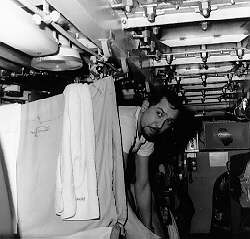 There are not always enough bunks to go around. When this happens, matresses are placed on the torpedo handling equipment and blankets are strung up for privacy. The people that get these racks are usually "Riders" or "NQP". (Non Qualified Personnel, or Non Qualified Pukes)